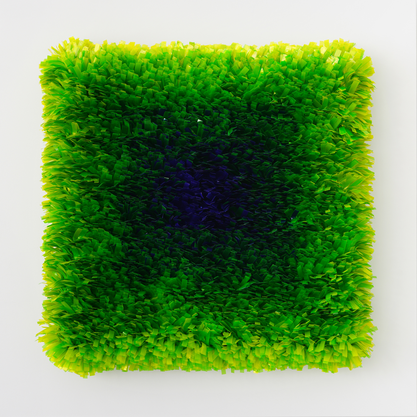 Das Werk: Water Sprite, 2024, Mixed Media, Plastiktragetaschen, Gitter, Samt, Batikfarbe, Leinwand, Holz, Acrylfarbe, Plexiglashaube, 80x80x16 cm. Foto: Axel Goeke
