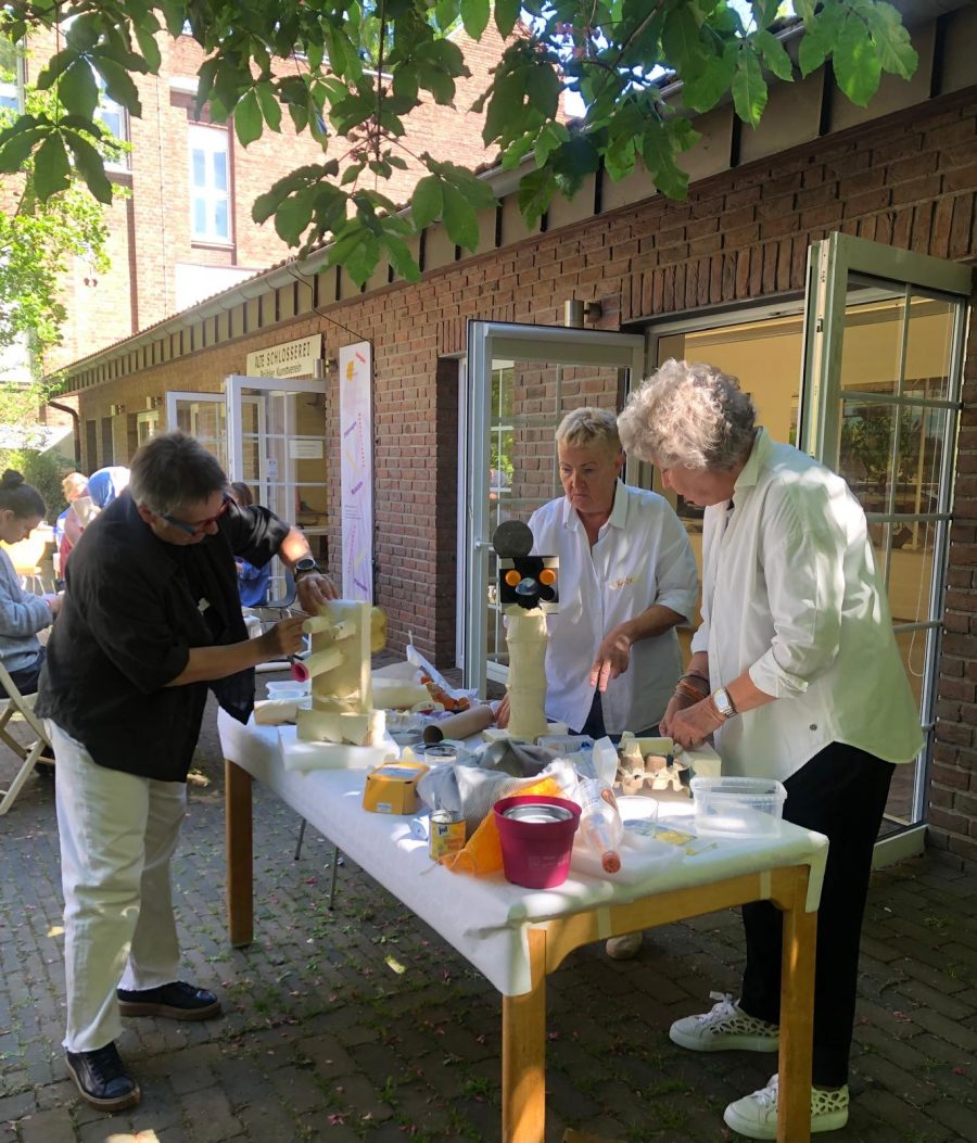 Max Ernst hat uns ein humor- und fantasievolles plastisches Werk hinterlassen. Wir kennen es als Bronzefiguren am Rathausbrunnen und vor und im Brühler Max-Ernst-Museum stehend. Seine kreative Formensprache aufgreifend gestalten wir nachhaltig aus Verpackungsmaterial eigene Plastiken. Kaschiert mit gekleistertem Papier und anschließend bronzeartig bemalt entstehen erstaunlich echt wirkende, sehr stabile Plastiken. So gelangen individuell die künstlerische, humorvolle Kraft und Fantasie des selbsternannten "Dadamax" in unsere Brühler Haushalte.