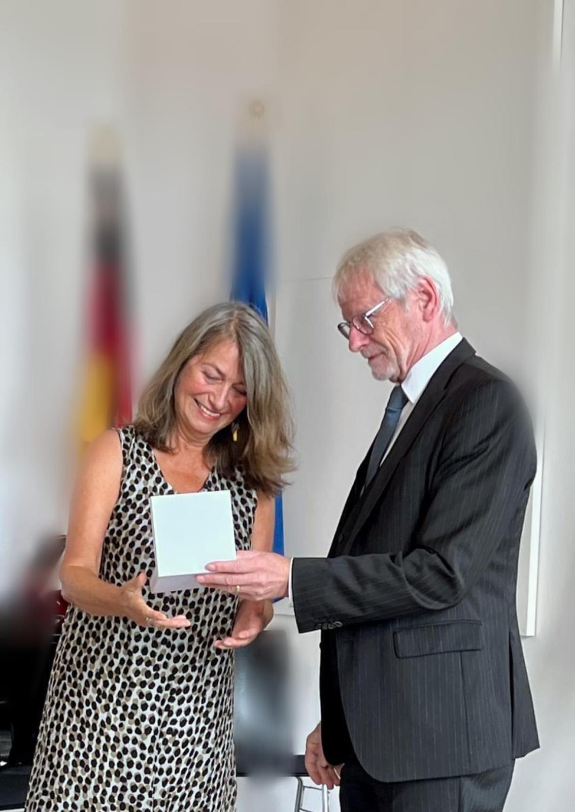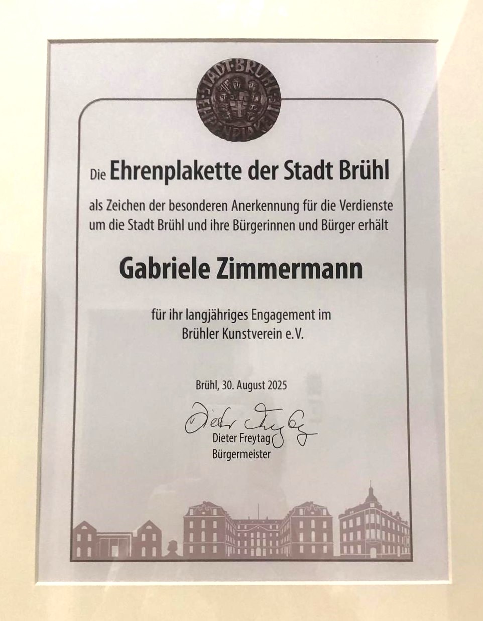 Die Ehrenplakette der Stadt Brühl als Zeichen der besonderen Anerkennung für die Verdienste um die Stadt Brühl und ihre Bürgerinnen und Bürger erhält Gabriele Zimmermann für ihr langjähriges Engagement im Brühler Kunstverein e. V.